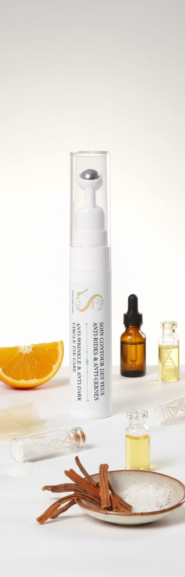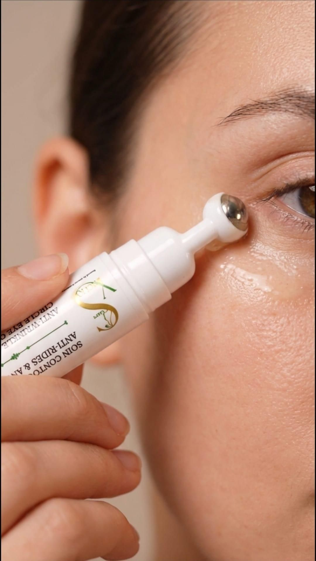 Le Soin pour les Yeux : Spécialement conçu pour atténuer les cernes et les rides, il contient de la niacinamide, de la vitamine C, du collagène, du rétinol, ainsi que de la poudre de nila et des extraits de réglisse. Appliquez-le matin et soir avec des mouvements circulaires, en utilisant la petite boule en céramique pour un effet décongestionnant.